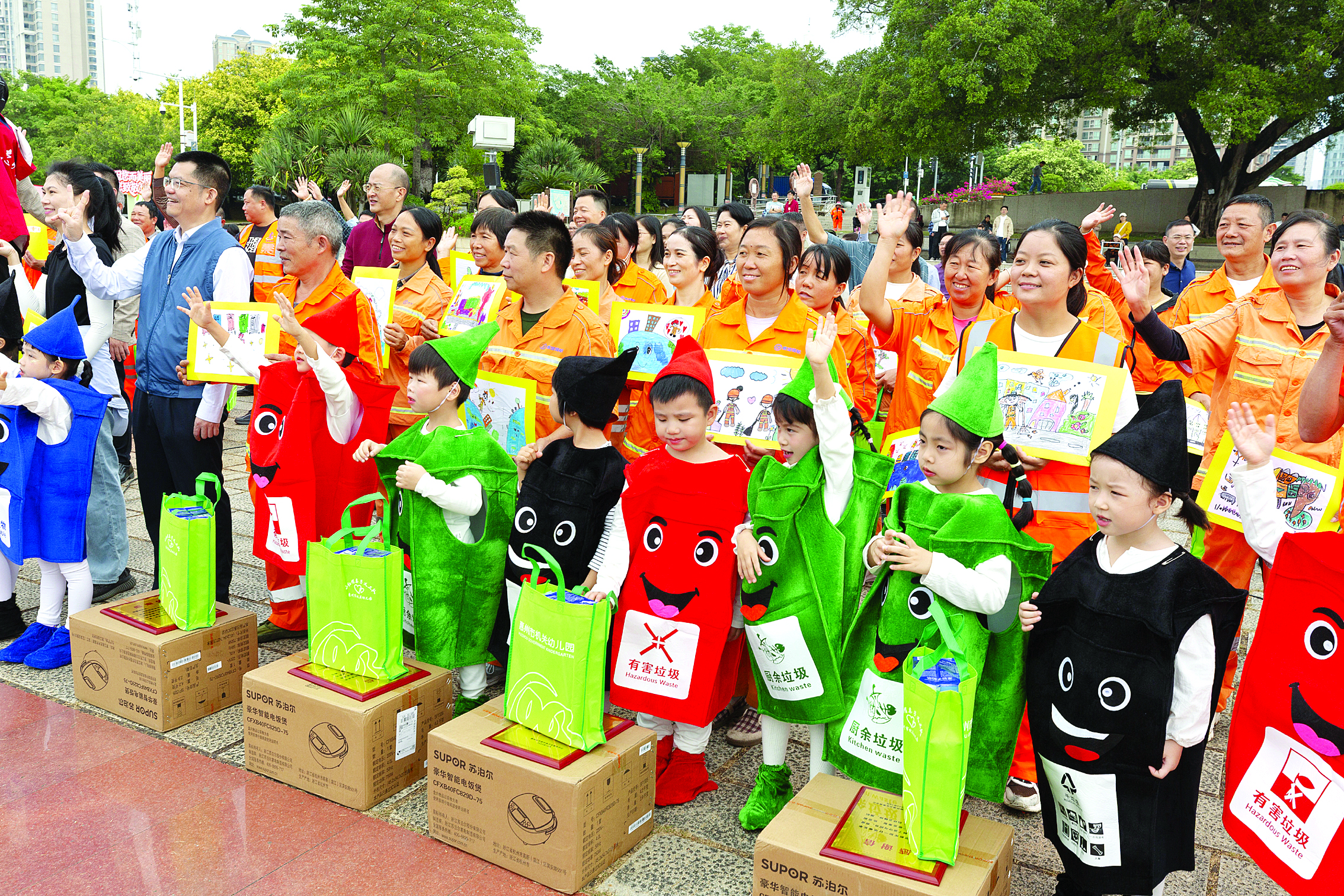 上午10時55分,活動迎來動人一幕;葜菔袡C(jī)關(guān)幼兒園的孩子們身著垃圾分類主題表演服,蹦蹦跳跳地登臺,獻(xiàn)上舞蹈《垃圾分好類,地球不喊累》。他們用稚嫩的動作比劃分類手勢,模仿?lián)焓袄,童趣十足的表演傳遞著垃圾分類理念。