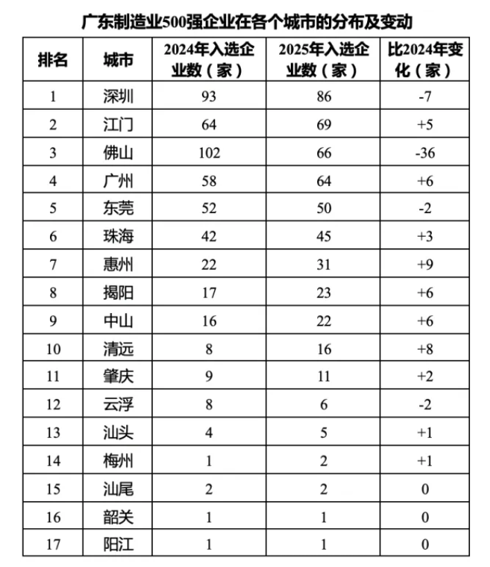 從區(qū)域分布來(lái)看,在制造業(yè)企業(yè)500強(qiáng)中,深圳以86家入選企業(yè)位居榜首,江門(mén)(69家)、佛山(66家)、廣州(64家)、東莞(50家)、珠海(45家)、惠州(31家)緊隨其后,七市合計(jì)411家企業(yè),占總量的82.2%。