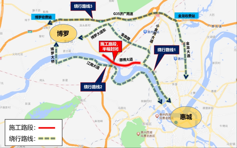 惠博大道(小金河立交至博羅縣界段)交通管制及繞行示意圖