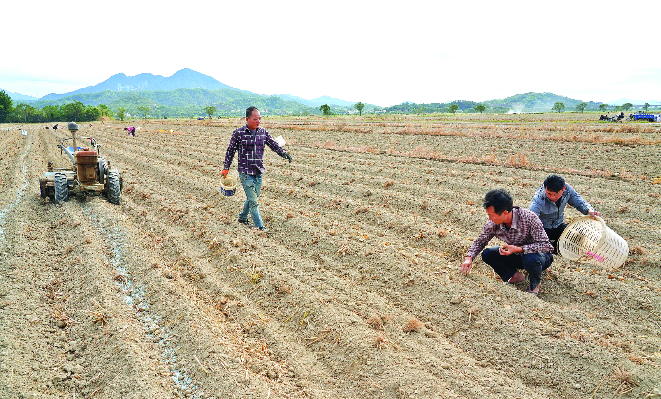 清早,惠東縣稔山鎮(zhèn)竹園村的廣袤農(nóng)田里,數(shù)臺新型農(nóng)機(jī)轟鳴駛過,在剛剛結(jié)束秋收的土地上有序進(jìn)行打田、旋耕、播種。農(nóng)戶們穿行其間,將一粒粒種薯精準(zhǔn)埋入肥沃的土壤,勾勒出一幅生動(dòng)的“冬種生產(chǎn)圖”。