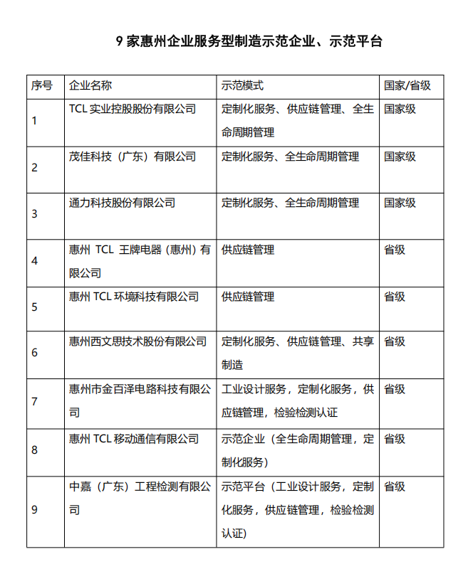 去年,惠州TCL移動通信有限公司、惠州市金百澤電路科技有限公司獲評省級服務(wù)型制造示范企業(yè),中嘉(廣東)工程檢測有限公司獲評省級服務(wù)型制造示范平臺。