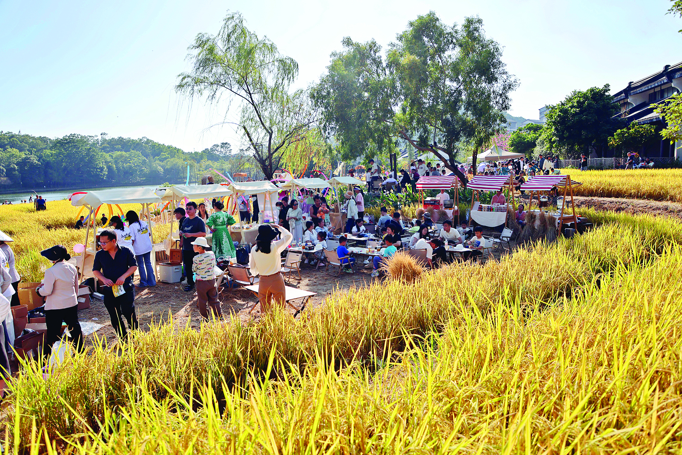 金黃稻浪間,一場別開生面的稻田歡聚在惠州湯泉稻田間展開。日前,市民在白色帳篷與紅白條紋遮陽棚下,或圍坐野餐、或打卡文創(chuàng)攤位,孩童們在稻田間追逐嬉笑,冬日暖陽裹著稻穗清香,將豐收的喜悅?cè)噙M(jìn)煙火氣里,串聯(lián)起鄉(xiāng)村文旅新業(yè)態(tài)。