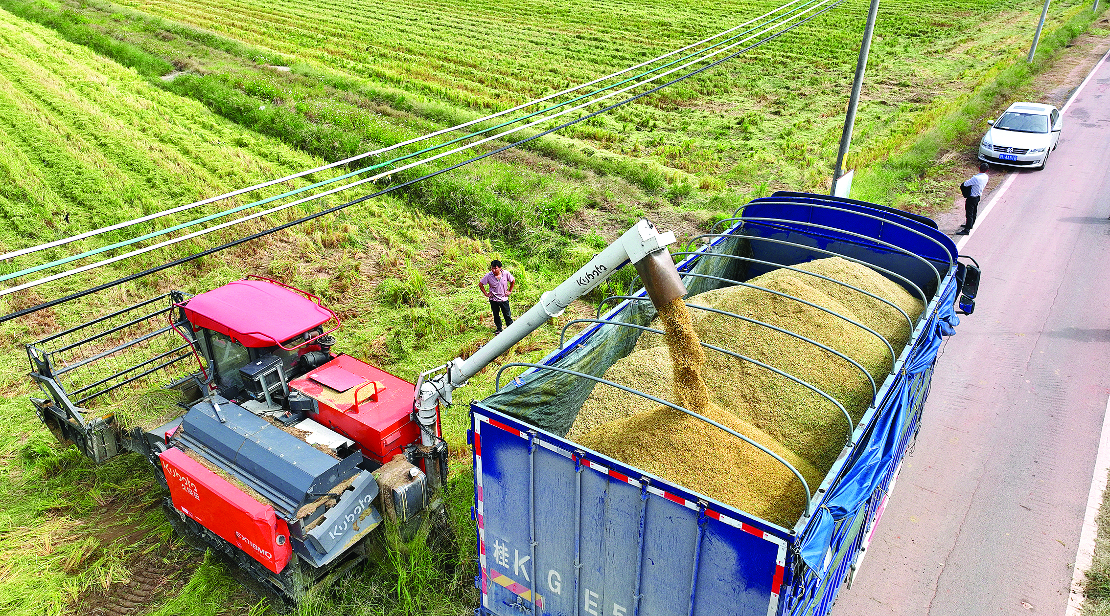 “今年晚造種植的超千畝水稻收成不錯,干稻谷畝產(chǎn)達到800多斤!闭驹谑崭瞵F(xiàn)場,張玖存彎腰捻起一粒稻谷,指尖搓開稻殼,看著雪白的米粒泛著瑩潤光澤,他難掩喜悅。