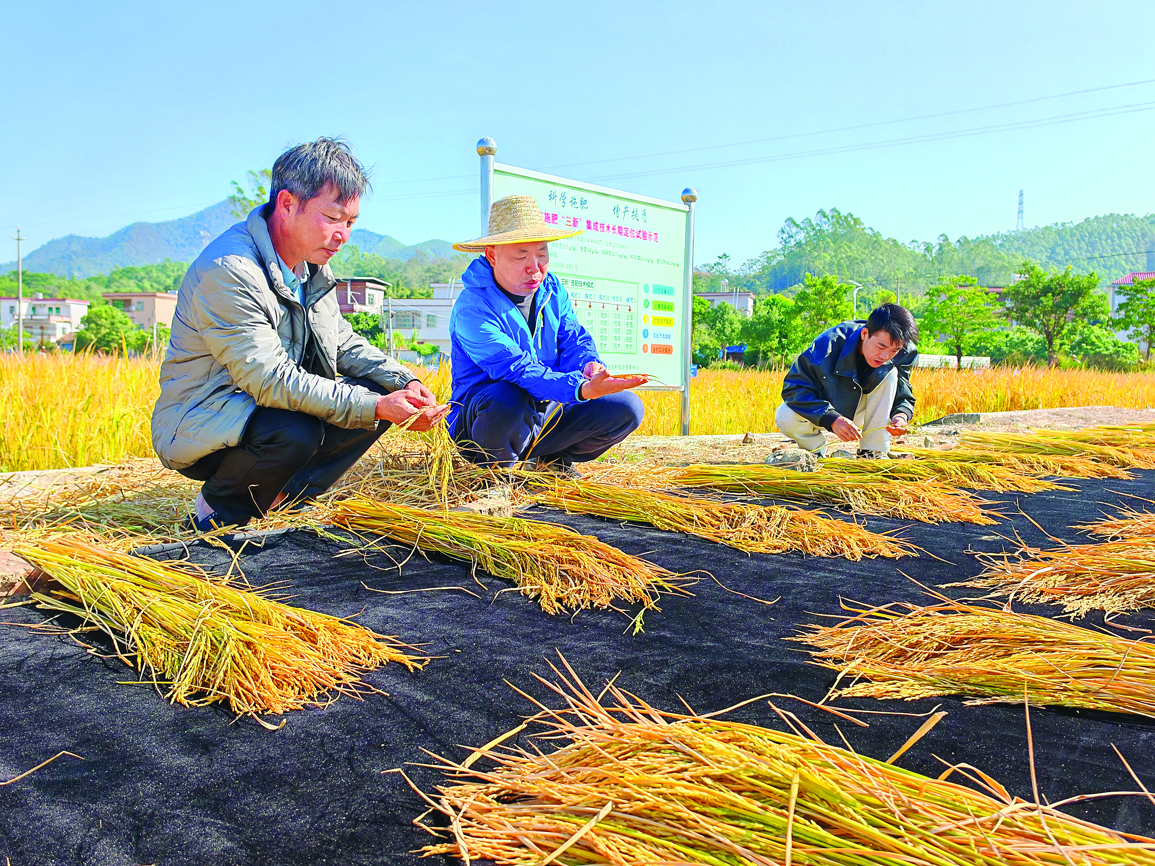 博羅縣公莊鎮(zhèn)寨崗村水稻種植基地內(nèi),連片稻田翻涌著金色的波浪,沉甸甸的稻穗壓彎了稻稈。近日,市、縣農(nóng)技人員與高校團(tuán)隊(duì)穿梭于整齊劃一的試驗(yàn)田,收割水稻、現(xiàn)場(chǎng)脫粒、測(cè)定產(chǎn)量,有序開(kāi)展水稻施肥“三新”集成技術(shù)試驗(yàn)的測(cè)產(chǎn)工作。在農(nóng)技人員和種植戶的見(jiàn)證下,技術(shù)應(yīng)用田塊干谷產(chǎn)量達(dá)到了550至570公斤/畝,比傳統(tǒng)施肥處理高出30至50公斤/畝。這項(xiàng)推動(dòng)水稻生產(chǎn)節(jié)肥增效的科技實(shí)踐,已成為引領(lǐng)水稻種植綠色變革的重要力量。