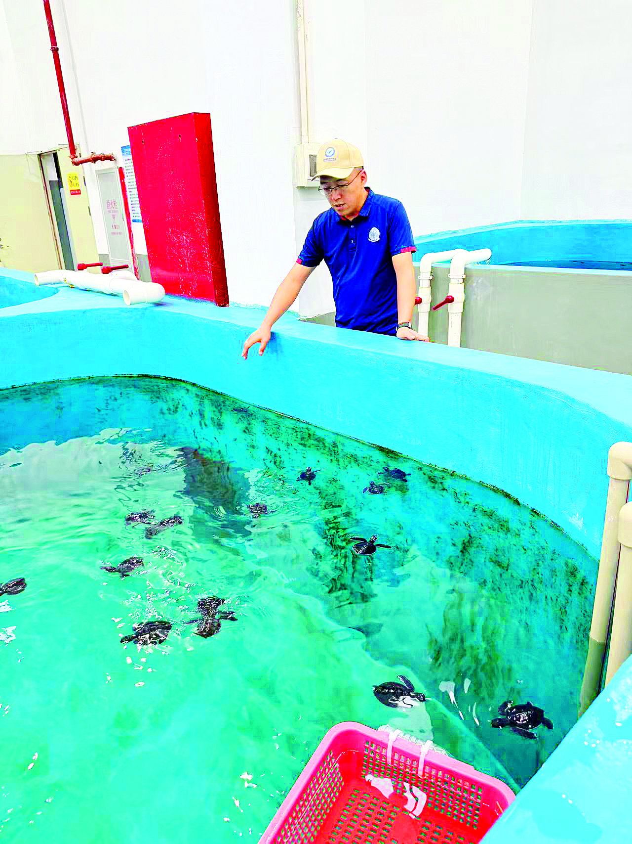 那么他是如何從一個海缸養(yǎng)殖愛好者變成工程師呢?“2018年,我跟一位老板來海龜灣工作,與保護(hù)區(qū)交流頻繁,他們知道了我對海水養(yǎng)殖方面有很深的研究!毙ざㄜ娬f,經(jīng)過多年的觀察和配合,他于2021年正式被廣東惠東港口海龜國家級自然保護(hù)區(qū)聘用,主要負(fù)責(zé)海龜幼苗的養(yǎng)殖。