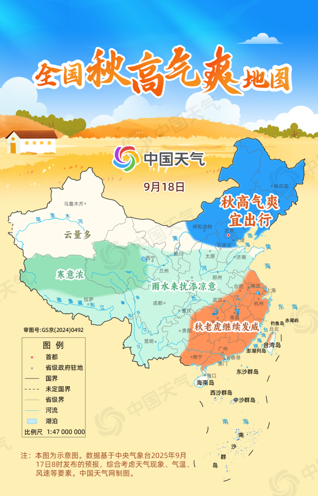 18日,秋高氣爽的范圍將縮小,吉林、遼寧、內(nèi)蒙古東部、華北北部等地秋高氣爽宜出行。黃淮多地雨水將增強,陜西、黃淮大部雨水來擾添涼意,多地最高氣溫將降至20℃以下,天氣有些涼了。