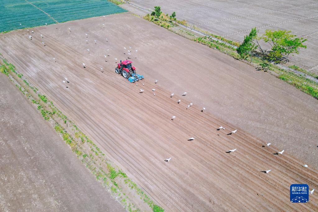 初夏時節(jié),江蘇省如皋市磨頭鎮(zhèn)天陽社區(qū)農(nóng)田里,農(nóng)機(jī)在田野間往來穿梭,成群的白鷺在翻耕的土地上覓食、嬉戲,構(gòu)成一幅美麗的生態(tài)畫卷。