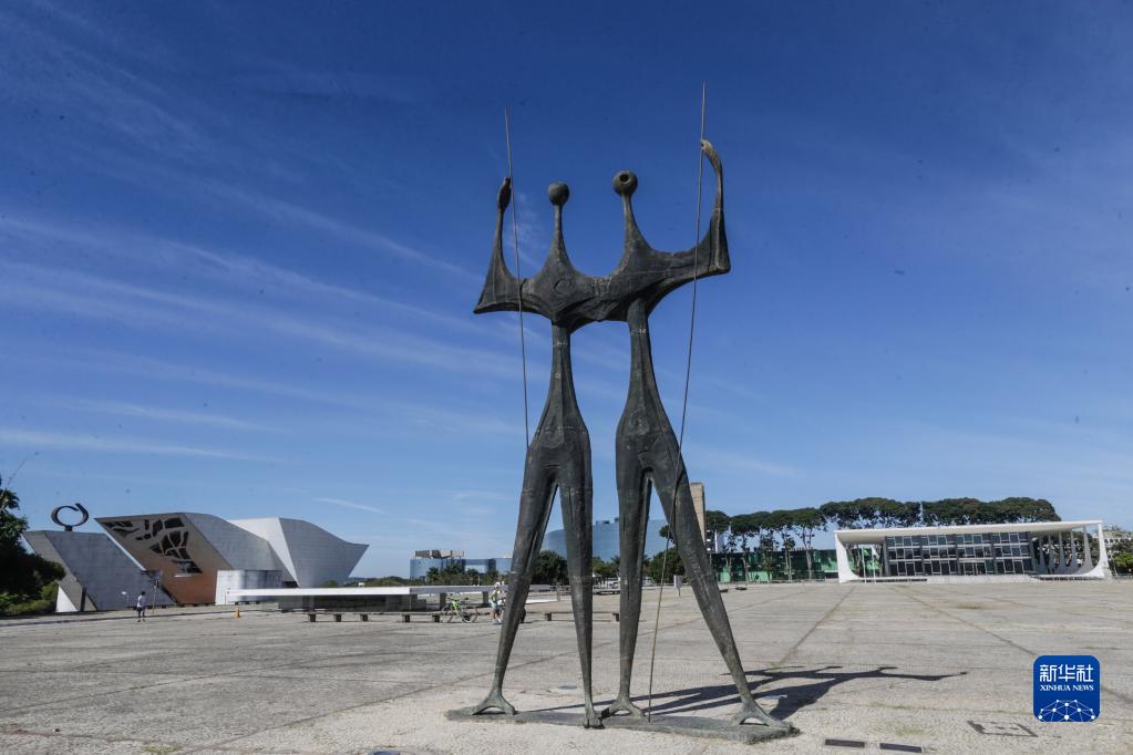 這是5月22日在巴西首都巴西利亞三權(quán)廣場(chǎng)拍攝的首都開拓者雕像。