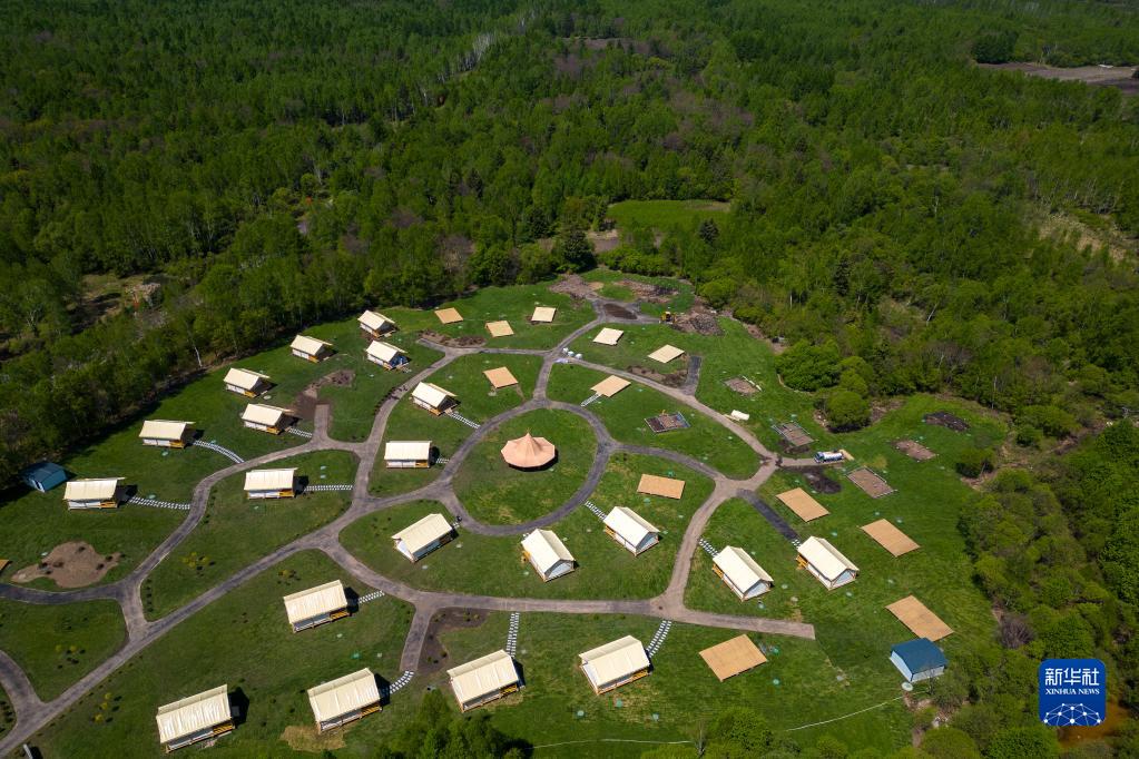 這是5月24日拍攝的伊春森工集團(tuán)上甘嶺林業(yè)局公司溪水林場在建的溪水野奢帳篷度假酒店項(xiàng)目(無人機(jī)照片)。