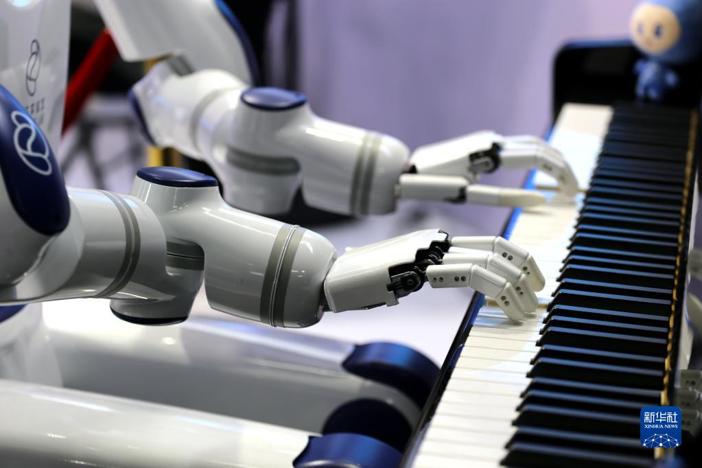 5月24日,機(jī)器人在峰會現(xiàn)場彈奏鋼琴。
