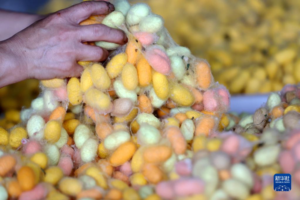 5月30日,德清縣新安鎮(zhèn)舍南村,一家蠶繭收購點(diǎn)的工人在分類整理彩色蠶繭。