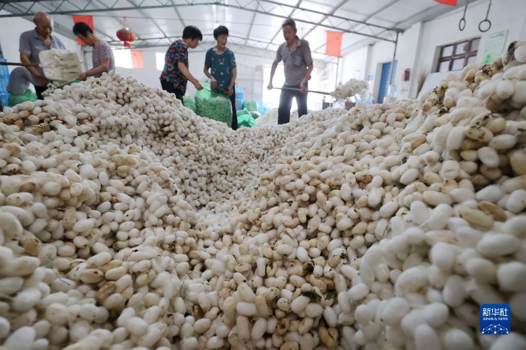5月30日,德清縣新安鎮(zhèn)百富兜村,一家蠶繭收購點(diǎn)的工人在分類整理蠶繭。