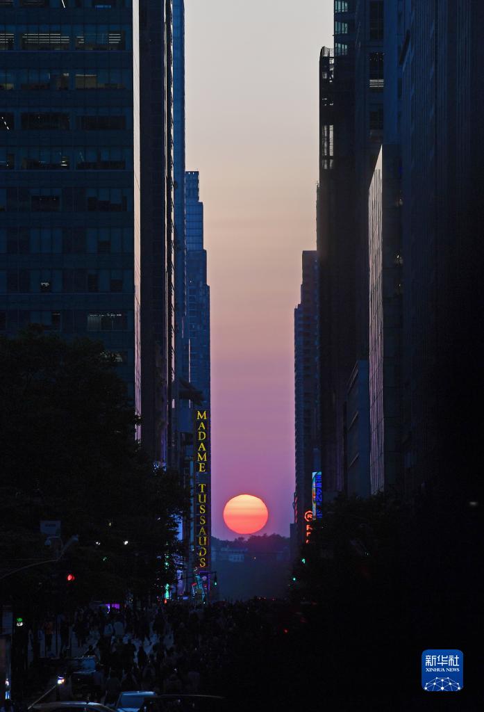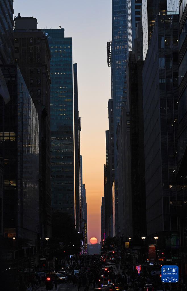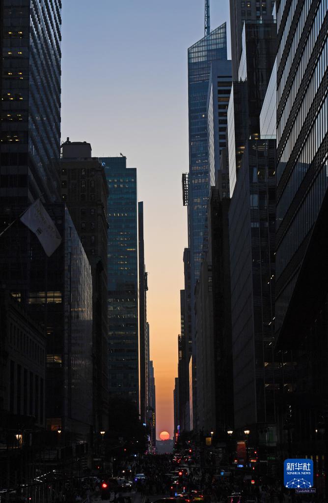 當(dāng)日,紐約出現(xiàn)“曼哈頓懸日”景觀。“曼哈頓懸日”是紐約市標(biāo)志性景觀,每年5月和7月出現(xiàn)兩次,指日落時(shí)太陽(yáng)正好出現(xiàn)在曼哈頓東西向街道正上方、似乎懸在兩側(cè)高樓大廈之間的戲劇性畫面。