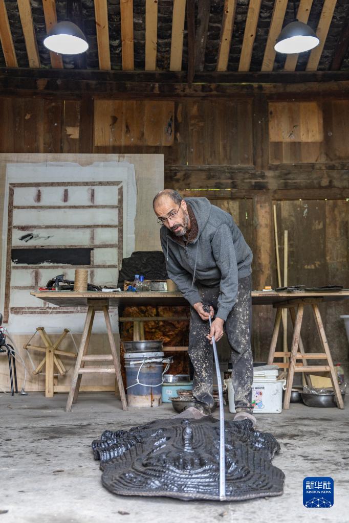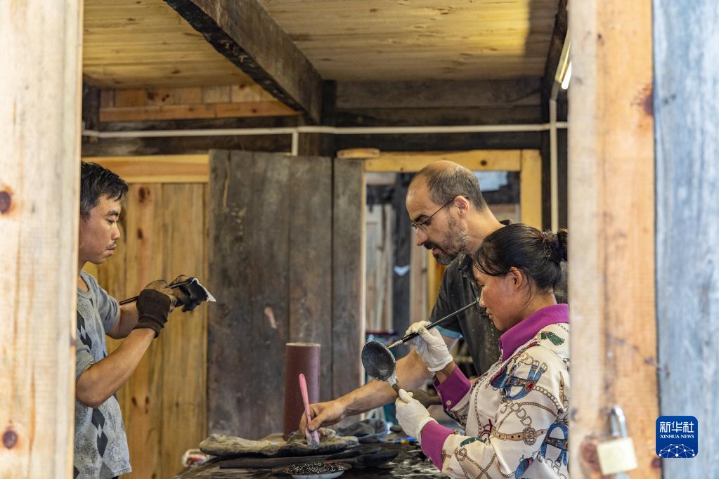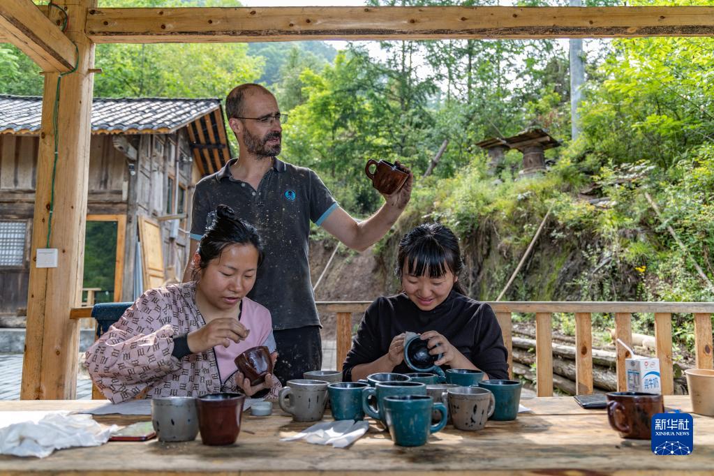 5月29日,在重慶市城口縣北屏鄉(xiāng)松柏村,文森·漆在工作室與當?shù)卮迕窠o作品上漆。