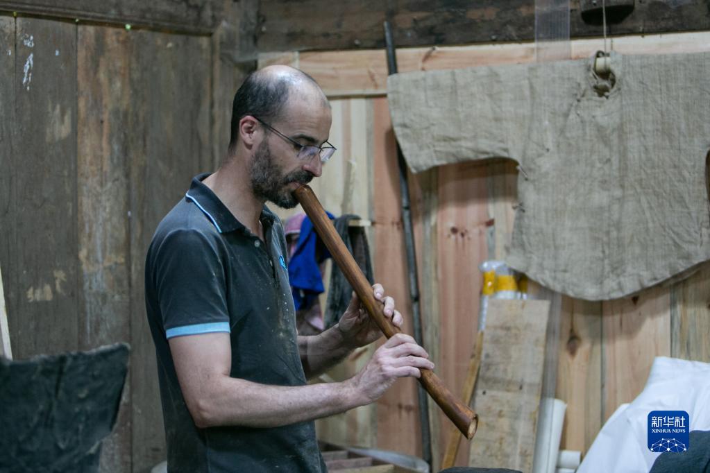 5月29日,在重慶市城口縣北屏鄉(xiāng)松柏村,文森·漆在創(chuàng)作間隙吹奏尺八。
