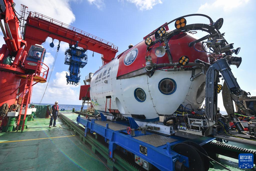 “深海勇士”號(hào)載人潛水器即將下潛開(kāi)始當(dāng)日的水下調(diào)查(5月27日攝)。