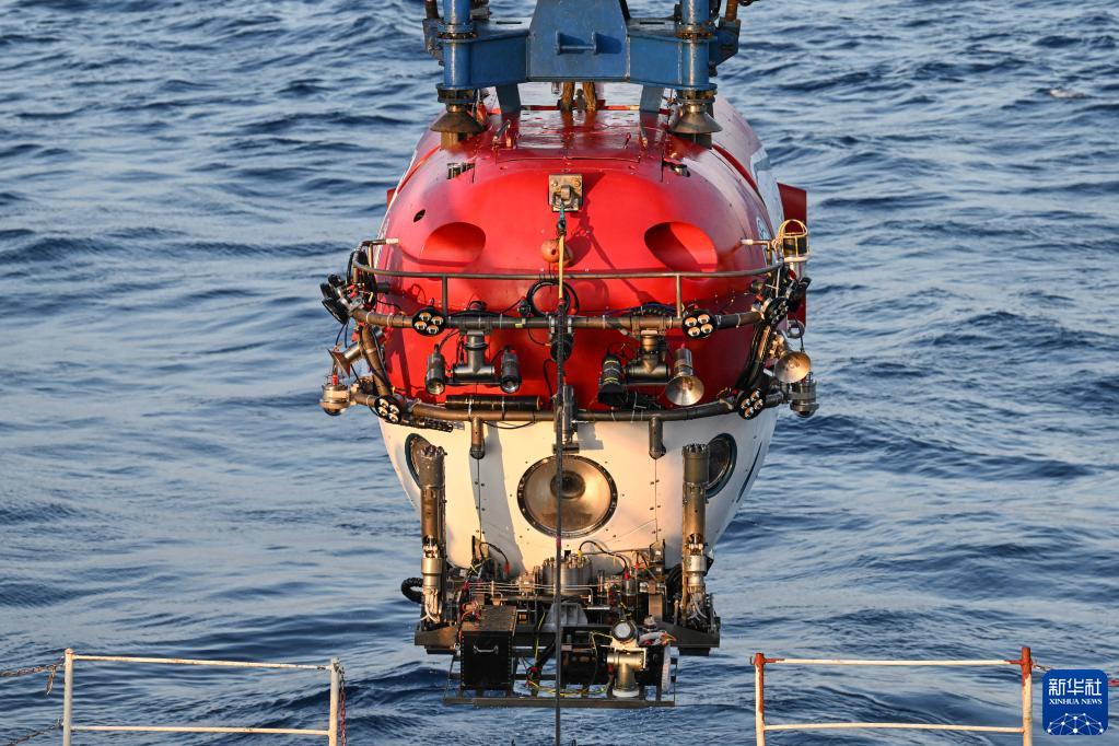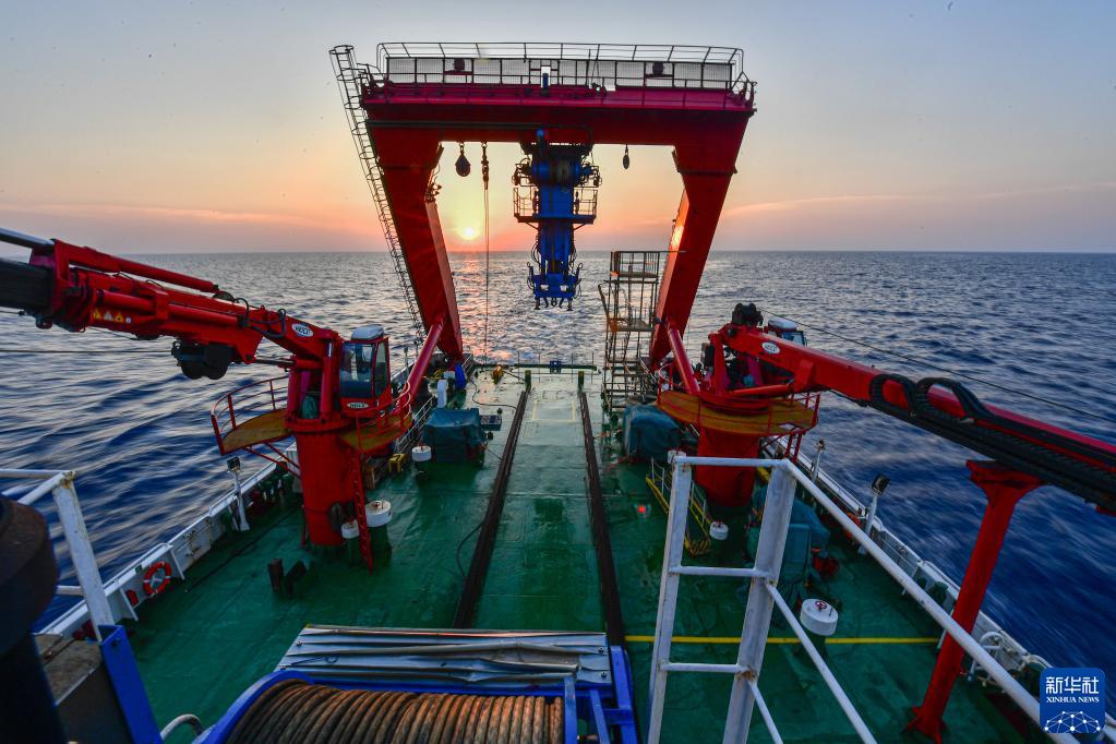在結(jié)束當(dāng)日的水下調(diào)查后,搭載著考古隊(duì)員的“深海勇士”號(hào)載人潛水器浮出海面(5月27日攝)。