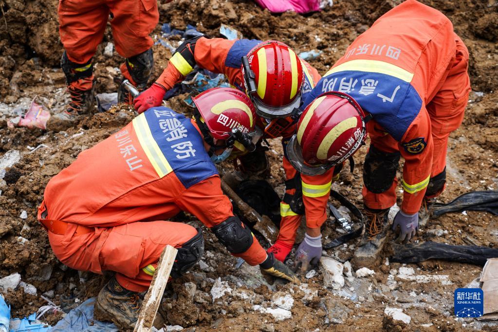6月4日,消防救援人員在樂山市金口河區(qū)永勝鄉(xiāng)鹿兒坪石板溝發(fā)生高位山體垮塌現(xiàn)場清理檢查。