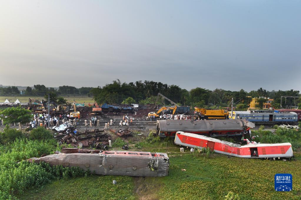 這是6月4日在印度奧迪沙邦巴拉索爾地區(qū)拍攝的列車脫軌相撞事故現(xiàn)場(chǎng)。