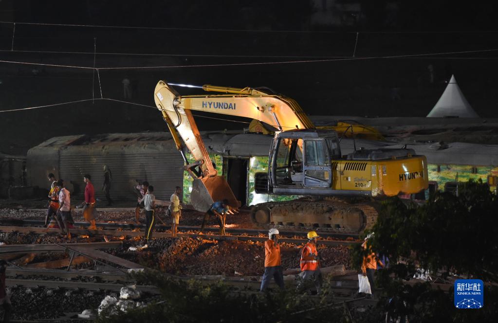 6月4日,救援人員在印度奧迪沙邦巴拉索爾地區(qū)的列車脫軌相撞事故現(xiàn)場(chǎng)工作。