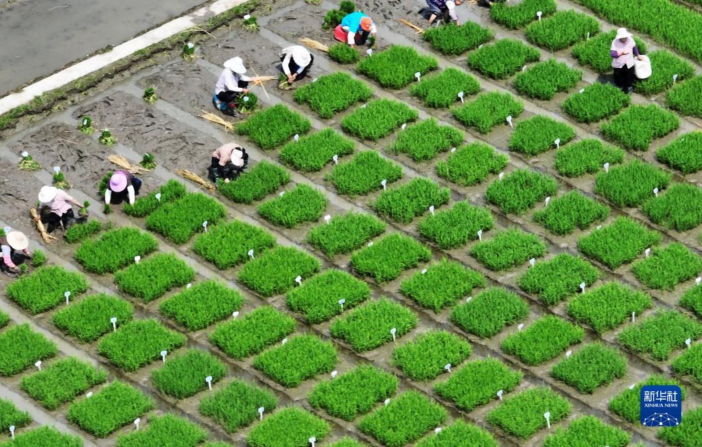 6月11日,在江蘇里下河地區(qū)農(nóng)科所(揚(yáng)州市農(nóng)科院),農(nóng)民在試驗(yàn)田里起秧苗(無人機(jī)照片)。