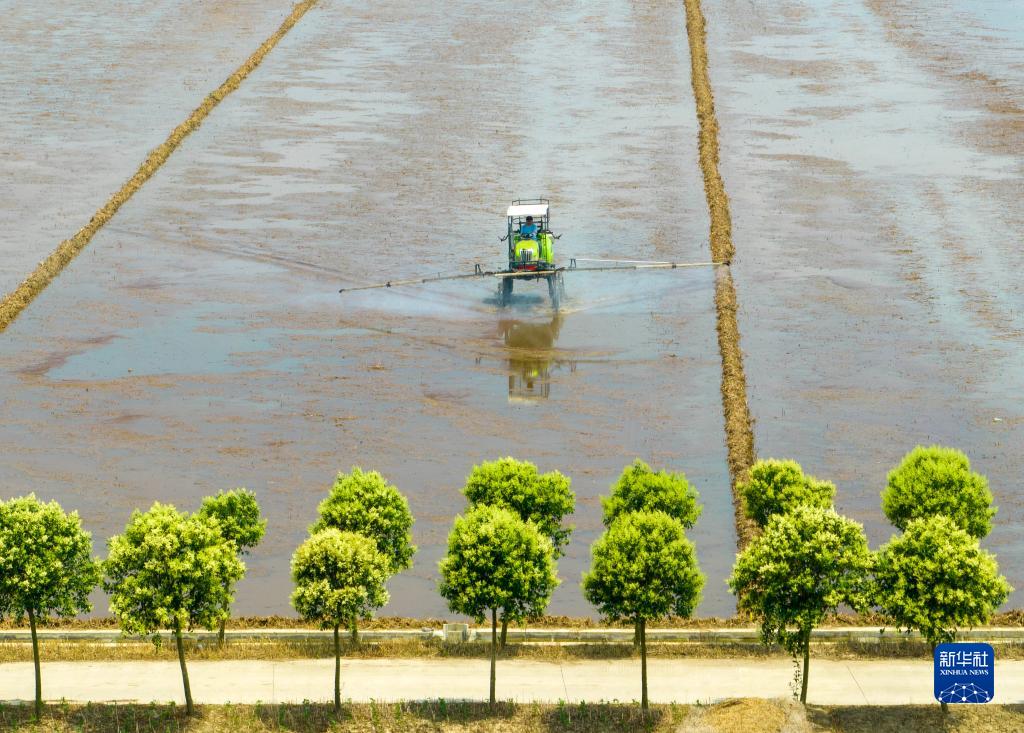 6月11日,在江蘇省興化市周莊鎮(zhèn)胡官村,農(nóng)民駕駛自走式噴霧機(jī)在水稻田中勞作(無人機(jī)照片)。