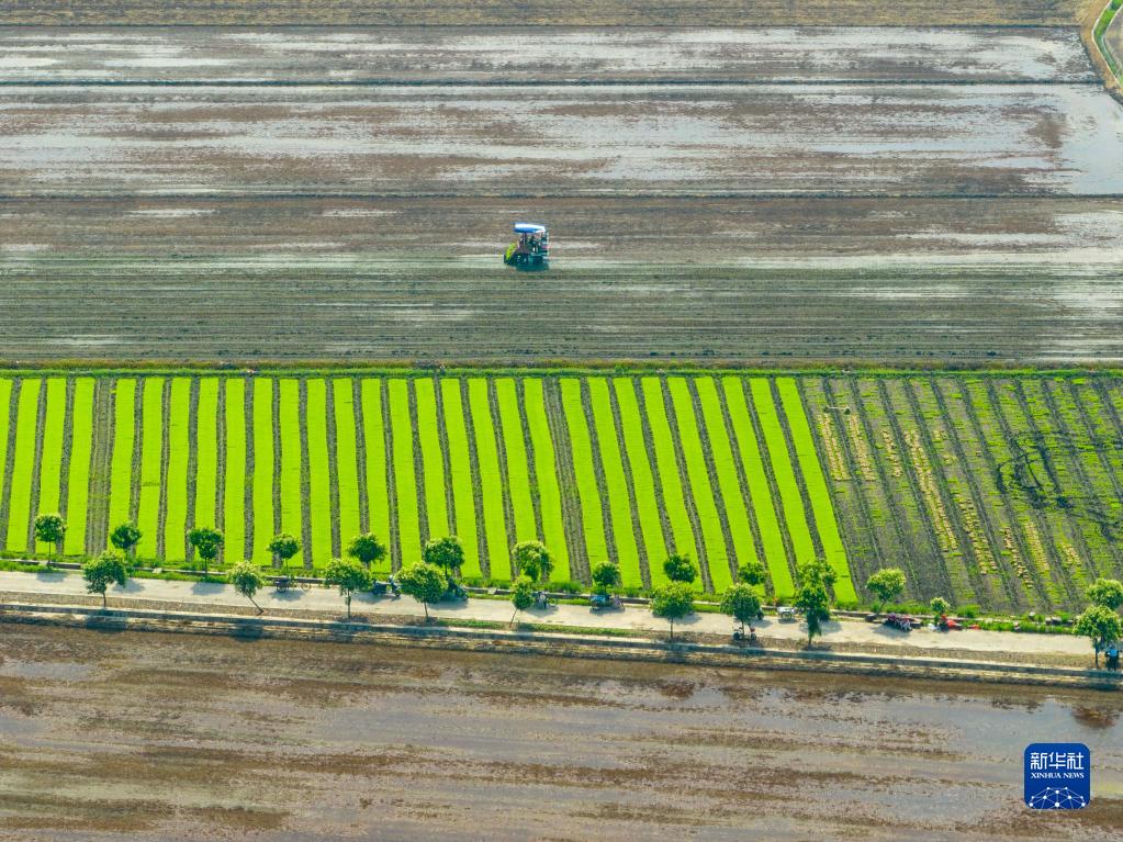6月11日,在江蘇省興化市周莊鎮(zhèn)四美村,農(nóng)民駕駛農(nóng)機(jī)進(jìn)行插秧作業(yè)(無人機(jī)照片)。