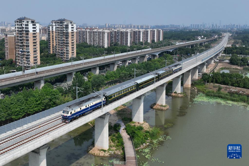 6月15日,檢測列車行駛在滬寧沿江高鐵南京市境內(nèi)的線路上(無人機照片)。