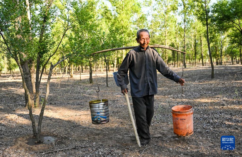 6月14日,曹扎娃擔(dān)水準(zhǔn)備給樹苗澆水。