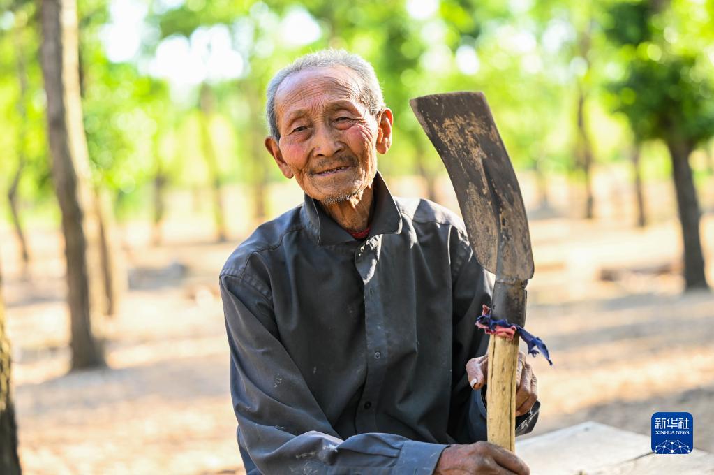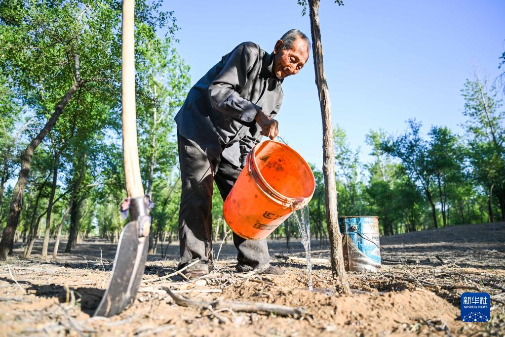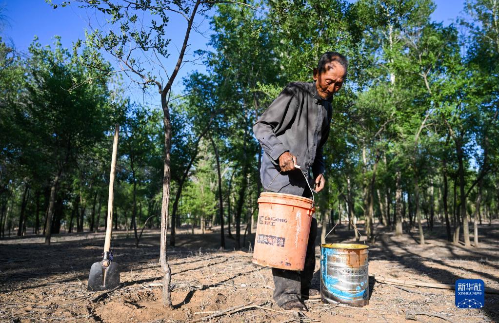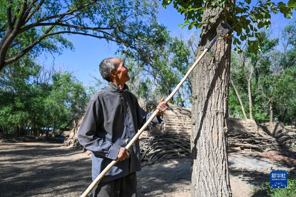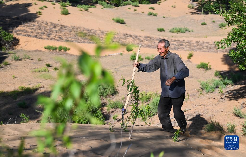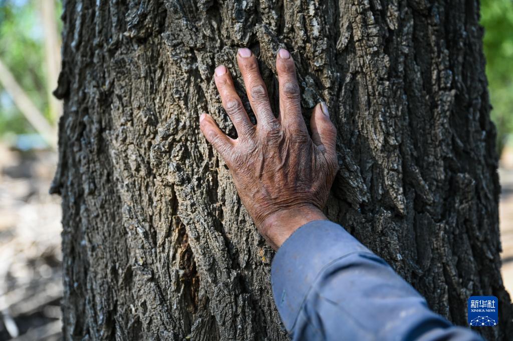 6月14日,曹扎娃撫摸一棵他親手種下的榆樹。