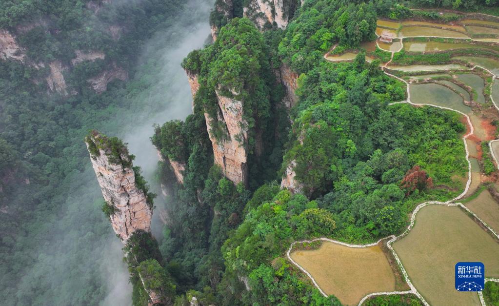 近日,湖南張家界迎來連續(xù)降雨。雨后,云霧在連綿聳立的峰林間飄蕩,懸崖峭壁之上的農(nóng)田在云霧中若隱若現(xiàn),構(gòu)成一幅幅獨特的生態(tài)畫卷。