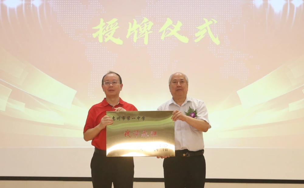 錢(qián)永剛教授(右)為惠州市第一中學(xué)“錢(qián)學(xué)森班”授牌。