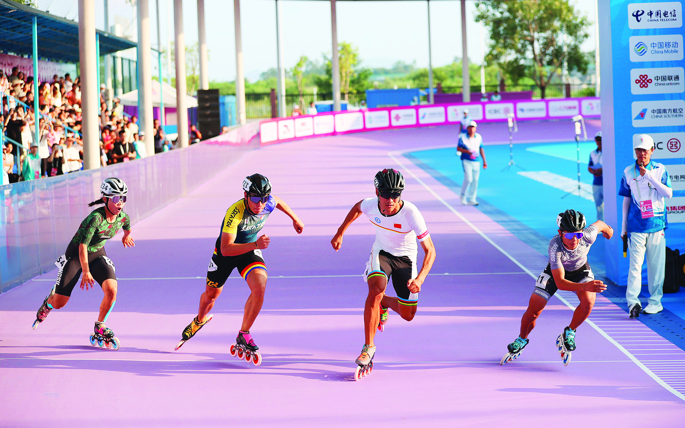 十五運會群眾比賽輪滑項目速度輪滑3000米男女混合接力賽現(xiàn)場;葜萑請笥浾邨罱I(yè) 攝