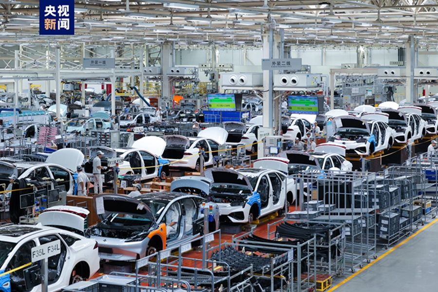 △全國(guó)每4輛新能源汽車就有1輛是“廣東造” 圖為廣汽埃安新能源汽車生產(chǎn)線