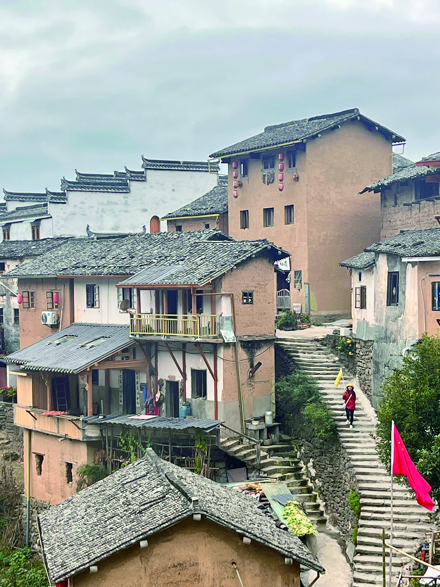 第三天,我們?nèi)チ恕巴钅献詈笠黄瑑敉痢标柈a(chǎn)土樓。土黃色房子依山而建層層堆砌錯(cuò)落有致,處處掛滿金黃色玉米和紅辣椒,一派古老恬靜的風(fēng)格,與世隔絕不爭光陰。下山途中天空突然飄灑起雨滴,土樓漸漸變得縹緲朦朧;仨煌行澳铣陌侔耸,多少樓臺(tái)煙雨中”的意境,這是我喜歡的江南煙雨。