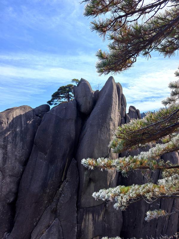 第四天重頭戲:登黃山。大美黃山依然歲月繾綣葳蕤生香,英姿挺拔傲視群雄。昨晚溫度驟降產(chǎn)生的霧凇今朝陽光照耀下熠熠生輝,隊(duì)友們個(gè)個(gè)摩拳擦掌全力以赴。纜車緩緩上升,所見之處皆是突兀的青黑巨石上一大片一大片的不老松,尉為壯觀。包括6位70歲長者在內(nèi)27人全體通過崎嶇陡峭的“好漢坡”,在聞名遐邇的迎客松前留下自己的形象。登上光明頂?shù)?7位勇士有7位60歲以上,他們?cè)诓紳M冰晶與霧凇的蜿蜒狹窄道路上奮勇前行。隊(duì)友們團(tuán)結(jié)互助相互攙扶互相配合,征服奇山險(xiǎn)峰挑戰(zhàn)自我,夢想成真不留遺憾……聽,凱旋歸來的笑聲多么爽朗,江山如畫我們亦是豪杰。